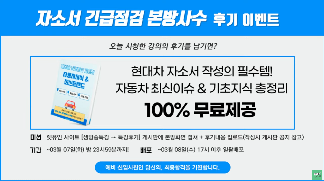 면접까지 가져가야 할 핵심 키워드, 자소서 작성 전 주의사항 등에 대해 알 수 있었고 예시를 보며 문항 분석도 해주셔서 도움이 됐습니다. 구체적인 예시를 많이 들어주셔서 좋았습니다.