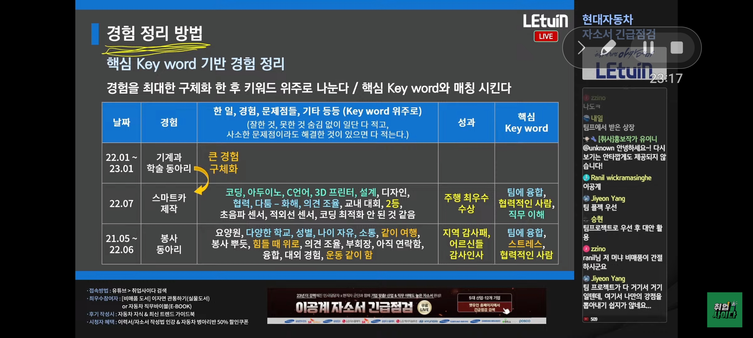 경험정리는 키워드 중심으로 자세하게 경험 날짜도 중요 순위를 매기고 1순위가 겹치지 않게 배치해라 자동차 산업 뿐만아니라 전반적으로 자소서 작성에 도움이 될 수 있는 내용이라 많은 도움 되었습니다. 특히 경험정리하고 순위를 매겨서 정리하라는 것에서 많은 것을 배운 것 같습니다. 또한 자소서와 면접을 같이 준비해야겠다는 생각을 하게 되었습니다.