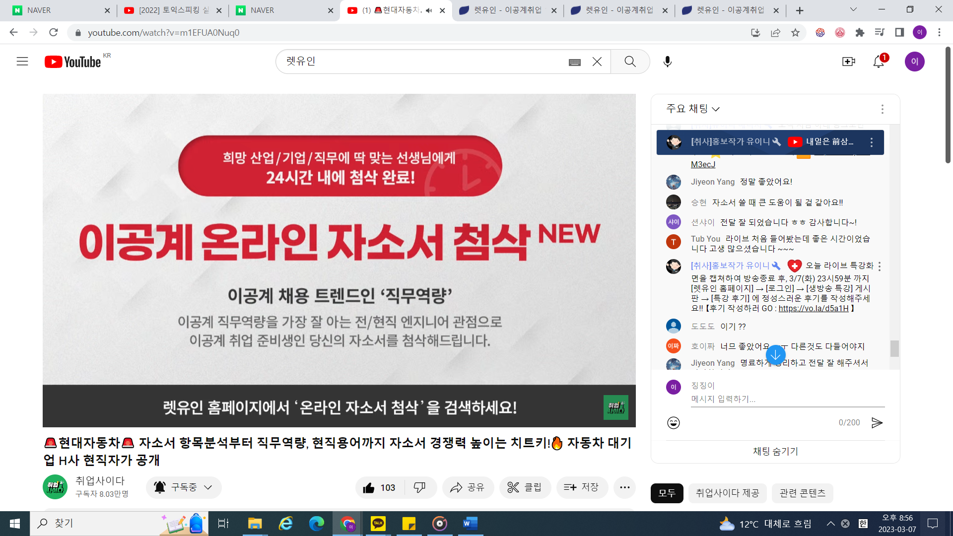 현대자동차 R&D 직무 자소서 문항을 어떻게 적어야 되는지에 대해 기본적으로 알려주시고 틀을 제시해주십니다. 또, 경험정리를 통해 자소서 - 면접을 따로 준비하는 것이 아니라 한번에 정리하는 것을 배웠습니다. 마지막 Q&A 시간을 통해 질문을 하고 답변을 받으며 직무 결정에 대해 도움을 많이 받았습니다. 감사합니다.