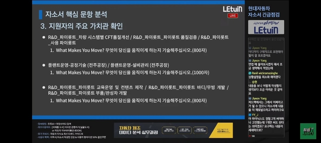 1. 안녕하세요 이번 긴급점검에 참여하면서 현대자동차 정말 취업하고 싶어서 듣게 되었습니다. 2. 강의 요약 직무 이해가 높은 사람, 스트레스를 관리하는 사람, 오래 다닐 사람. 팀에 융합이 잘 되는 사람, 협력으로 성과를 내는 사람 과 관련된 경험을 정리하고, 특히 직무 이해가 높은 사람이 되기 위해 직무를 정해 그 직무와 관련된 활동을 앞으로도 해내 가야 한다는 것을 알게 되었다. 경험 정리는 핵심 keyword을 바탕으로 정리하고, 자신 있는 경험을 순서로 순위를 나눈다. 자소서는 제목, 핵심 문장, 경험, 마무리 문장으로 구성한다. 현재 현대 자동차에서는 융합 인재를 선호하므로 다양한 것을 배웠다는 것을 강조하는 것도 중요!! 3. 느낀 점 담 학기에 취업이 시작하는 단계라 준비하는 단계라 생각하고 들었는데 듣고 나니깐 정말 준비해야할것이 많다라고 생각이 들었구요. 이번 년도를 진짜 현대자동차 입사에 초점 맞춰서 경험을 준비하는 것이 먼저이다라고 느꼈습니다. 다양한 렛유인 현대자동차 관련, 자동차관련 강의듣고 모두 취뽀해요~~ 준비해주신 렛유인분들도 감사하고 수고하셨습니다!!!!!!!!