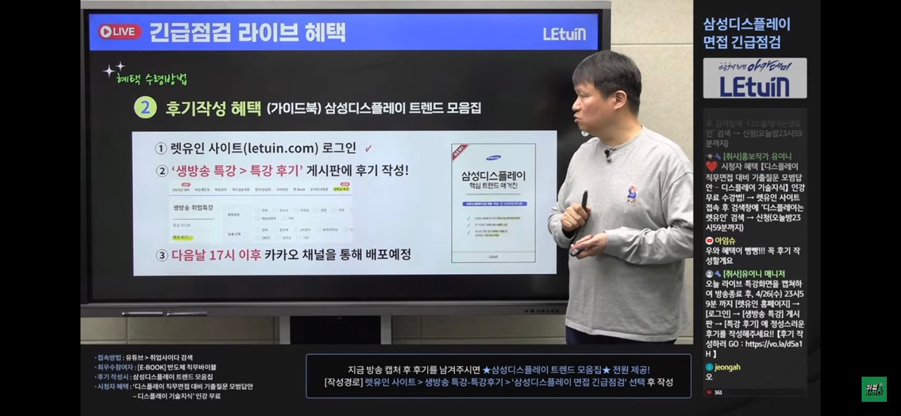 삼성디스플레이 직무면접 프로세스 및 최근 면접 기출문제를 통한 면접 시 가이드라인을 설명해주셨습니다. 또한, 자소서를 기반으로 한 면접 요령에 대해 자세히 설명해주셨습니다. 평소 삼성디스플레이에 많은 관심을 가지고 있었는데 전혀 생각치도 못하게 서류에 붙고 GSAT까지 보게되어 정신이 없는 와중에 좋은 강의를 접하게 된 것 같아 너무 감사합니다. 이 강의를 토대로 삼성디스플레이에 취업성공하도록 하겠습니다. 감사합니다!