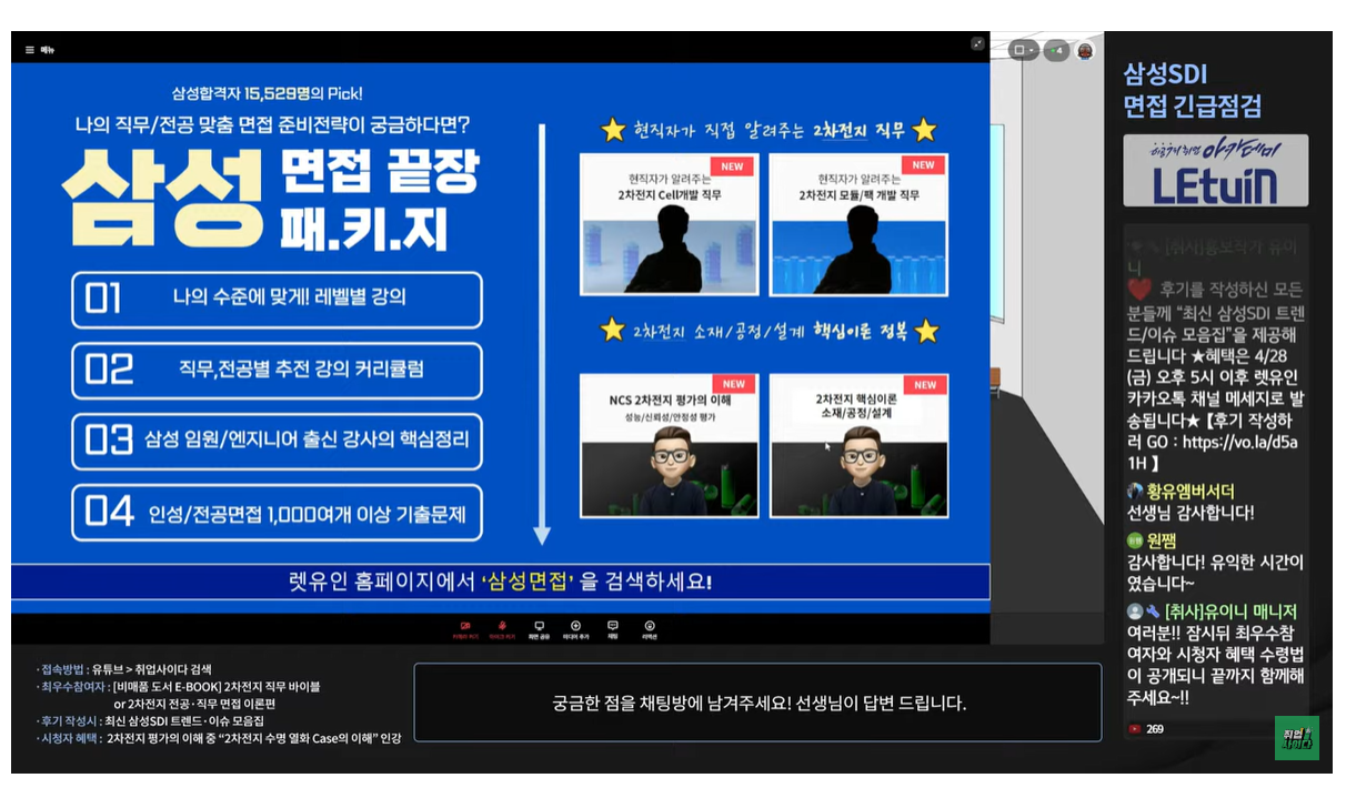 오늘 실시한 강의를 통해 상반기 삼성sdi 직무면접 어떻게 준비해야할지 방향성에 대해 알 수 있었어요. 꼭 삼성SDI 합격해서 오늘 본 강의가 헛되지 않게 하고싶어요 모두들 취뽀하십시오 !!