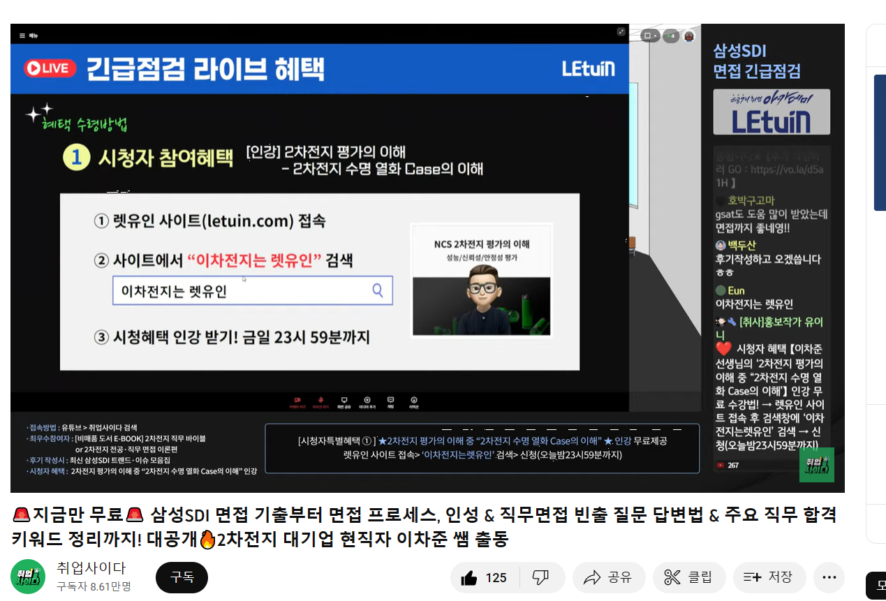 1. 시청 인증 2. 강의 내용 면접 진행 방식을 먼저 설명해주신 후에 직무면접 질문 예시들 보여주셨습니다. 또한 SDI 내 팀이 어떻게 나뉘는지도 설명해주셨습니다 주요 직무별로도 기출 키워드를 제시해주셔서 좋은 정보 많이 얻었습니다. 마지막에는 자소서 내용을 예시로 어떤 식의 질문이 나올 수 있는지도 다뤄주셨습니다. 3. 강의 느낀점 일단 직무면접 문제풀이가 어떤 식으로 나올지 전혀 몰랐는데 정보도 얻고 어떤 방향으로 준비할지 알 수 있어 유익했습니다. 기초 전공 내용과 배터리 관련 지식 위주로 공부해야겠다는 생각이 들었습니다. 좋은 정보 얻었어요 감사합니다!