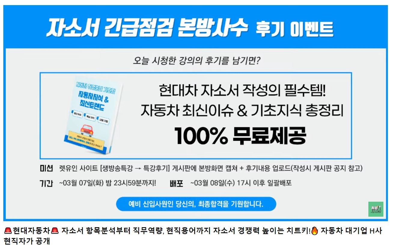 제가 속한 학과가 자동차와 크게 관련이 없는 학과라 현대자동차를 준비하는 입장에서 많이 답답했고 두려웠습니다. 공고는 계속해서 나오는데 어떻게 시작해야 할 지도 모르는 상태였습니다. 하지만 강의에서 자소서를 어떻게 작성하면 되는지와 반드시 짚고 넘어가야 할 방향에 대해서 제대로 제시를 해주셔서 많은 도움이 된 것 같습니다. 해당 강의를 바탕으로 앞으로 자소서 작성시 많은 경험을 녹여낼 수 있도록 노력해야겠다고 생각하였습니다. 양질의 강의를 무료로 제공해주셔서 정말 감사합니다. 지원동기와 직무에대해 확실히 알아갈 수 있어서 좋았습니다. 많은 강의가 아직 남아있는데, 기대가 많이 됩니다.