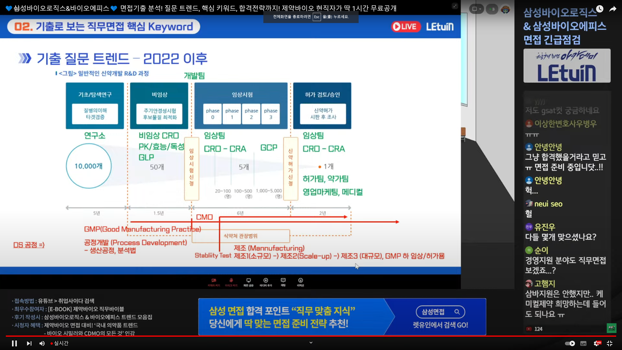 2. 강의 내용 - 과거 기출 질문 트렌드 & 2022년 이후 최신 질문 트렌드 - 기출 질문 예시 (ex. 세포 배양시 CO2 농도가 높아졌을 때 어떤 조치를 취해야 하는가? 외) - 자기소개서 항목 분석 소개 3. 강의 느낀 점 대기업 면접이기에 시작도 전에 많은 두려움을 갖고 있었습니다. 하지만 오늘 특강을 통해 면접 준비 방향의 큰 틀을 잡을 수 있었습니다. 덕분에 면접에 대한 두려움도 떨쳐낼 수 있었던 것 같습니다. 도움이 가장 많이 되었던 것은, 구체적인 사례를 소개해셔서 쉽게 이해할 수 있었던 것입니다. 양질의 강의 해주셔서 감사드립니다.