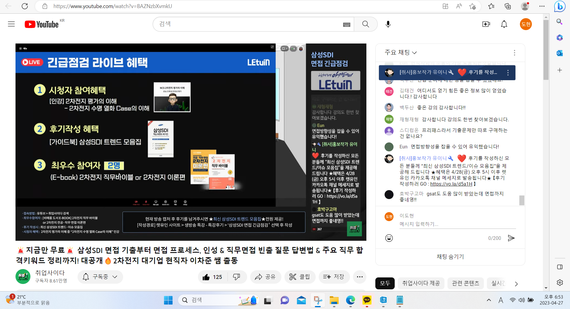 다음달 상반기 삼성그룹의 면접 일정이 있는데 삼성 SDI의 면접 프로세스와 지원 직무 별로 준비해야할 사항들에 대해 배울 수 있었습니다. 뿐만 아니라 작년 하반기, 상반기의 기출문제 등에 대해 배울 수 있었고, 곧 닥쳐올 면접에 대비해 더 많은 준비를 할 수 있도록 도와줬습니다.   | |||