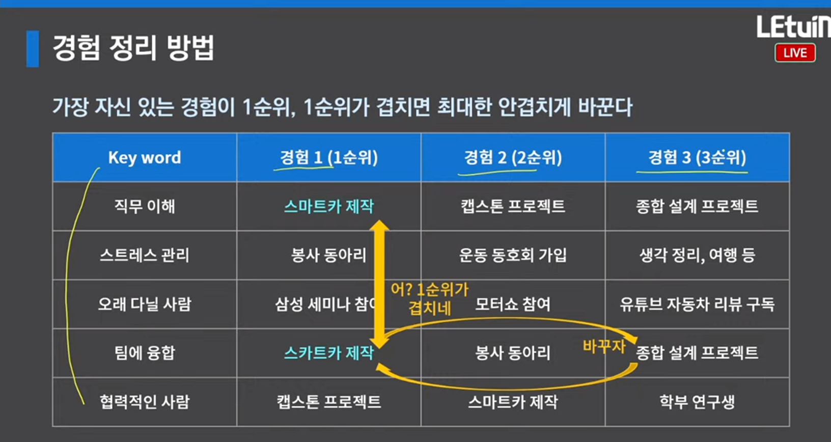 강의 목차 1. 면접까지 가져가야 할 핵심 키워드 직무 이해가 높은 사람/스트레스를 관리하는 사람/오래 다닐 사람/팀에 융합이 잘 되는 사람/협력으로 성과를 내는 사람 2. 경험 정리 방법 표로 작성, 키워드 위주로 정리 후 그림과 같이 경험 순위를 정함 3. 자소서 작성법 4. Q&A 느낀점 직무 관련 경험이 없더라도 자소서를 작성할 수 있는 방법에 대한 노하우를 들을 수 있어 좋았습니다. 또한, 경험을 통한 인사이트를 글에 녹여낼때 다른 강의들은 인사이트를 적어라만 강조하지 어떤 식으로 어필을 하고 적어야 할지 잡아주는 것이 아니어서 작성 방향에 대해 감이 안잡혔는데, 어필하는 방법을 예시를 들어가며 자세히 설명해줌으로써 작성 방법에 도움이 많이 되었습니다. 마지막으로 자소서를 작성하는 지원자와 자소서를 읽는 현업자를 적절히 대조해가며 설명해줌으로써 지원자가 흔히 자소서에서 저지르는 실수가 무엇인지 알 수 있어 도움이 되었습니다.