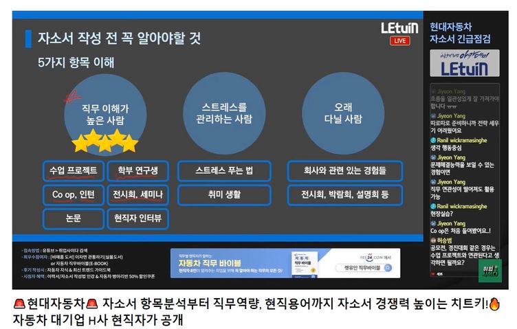 강의 내용 라이브 특강 제목대로 자소서 항목분석과 직무역량 등의 내용이었습니다. 그리고 최신채용트렌드, 면접관이 좋아하는 키워드 5가지, 경험정리 및 구체화 방법 등도 알 수 있었습니다. 특히 Q&A 시간을 통해 현직자의 의견을 들어보고 궁금증을 해결할 수 있었습니다. 느낀점 자소서 소재 찾기가 막막했는데 어떤식으로 찾아가야하는지 방향을 알 수 있어 좋았습니다. 그리고 자소서 항목을 자세하게 분석해 주셔서 어떤 인재를 원하는 것인지 키워드 등을 알 수 있어 좋았습니다. 앞으로 남은 다른 라이브 특강도 꼭 듣고 싶습니다!