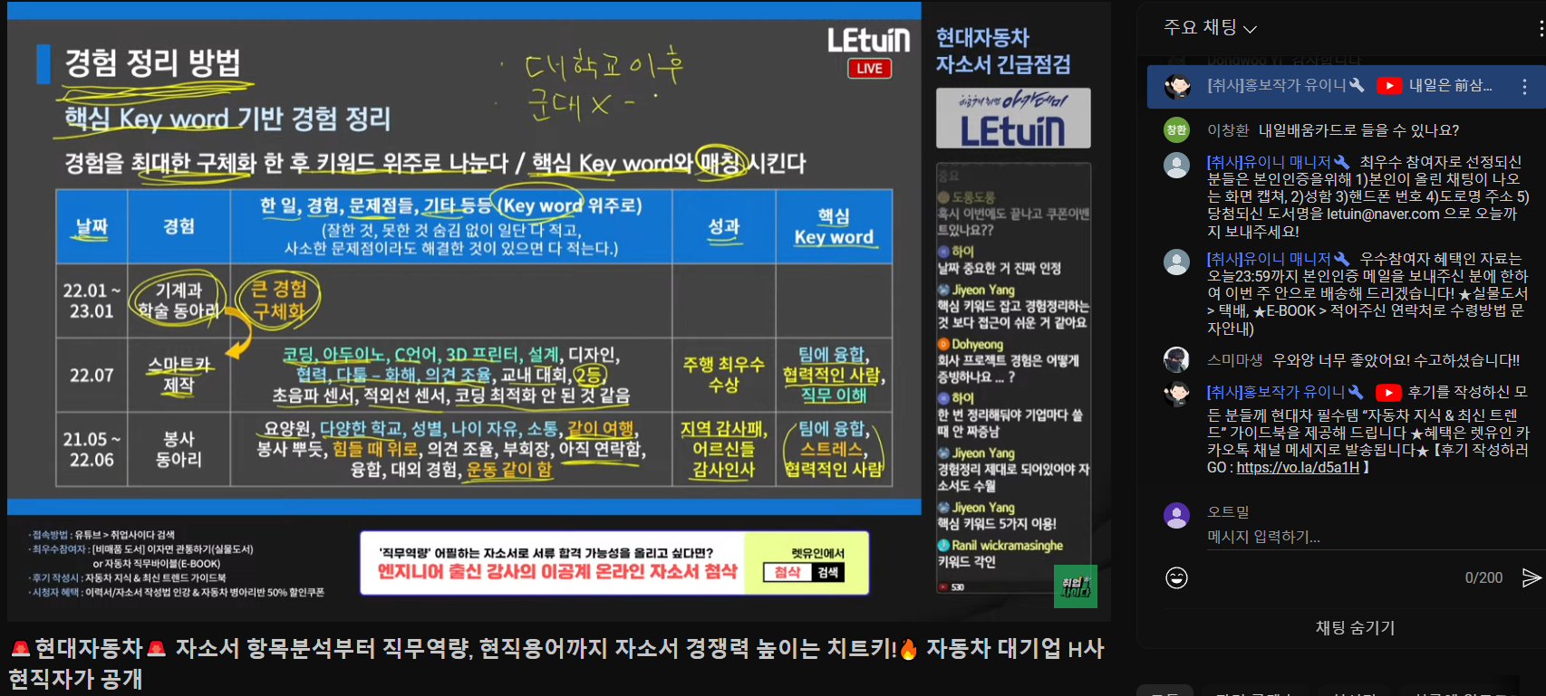 자소서 항목의 내용들을 다시 한번 점검, 첨삭하여 실수 없이 완벽한 자소서, 더 어필할 수 있는 자소서를 완성할 자신감이 생긴 것 같습니다. 사실 여러 자소서들을 정리하면서 어려운 부분이 많았는데 오늘 강의를 통해 노하우를 잘 녹일 수 있을 것 같습니다. 이해하기 쉽게 잘 풀어주신 덕분입니다. 많은 도움이 되었습니다. 감사합니다.