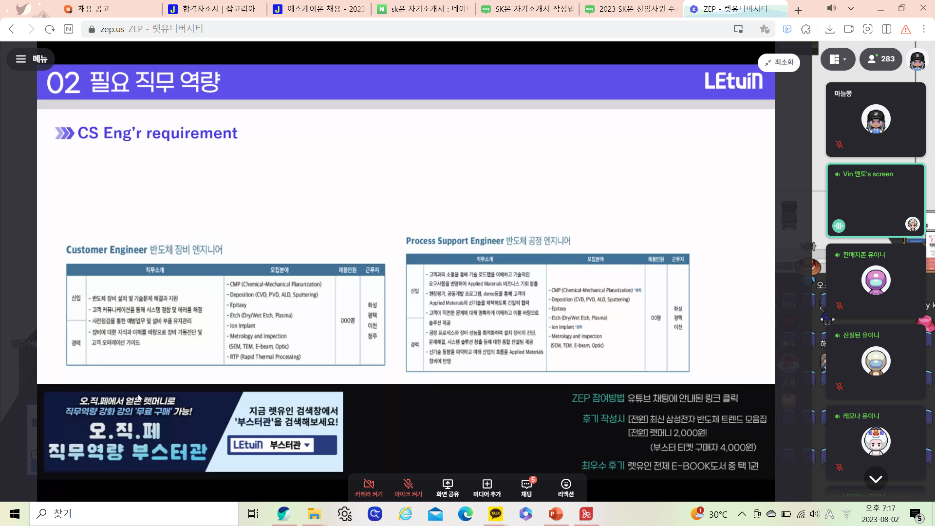 반도체공정 중 양산기술에 대해 배우게 되었습니다. 양산기술을 지원하는 사람이 갖추어야할 스펙뿐 아니라 하루 일과에 대해서도 배울 수 있었고 구체적으로 취업 후 어떤 일을 하는지에 대해 알 수 있었습니다.