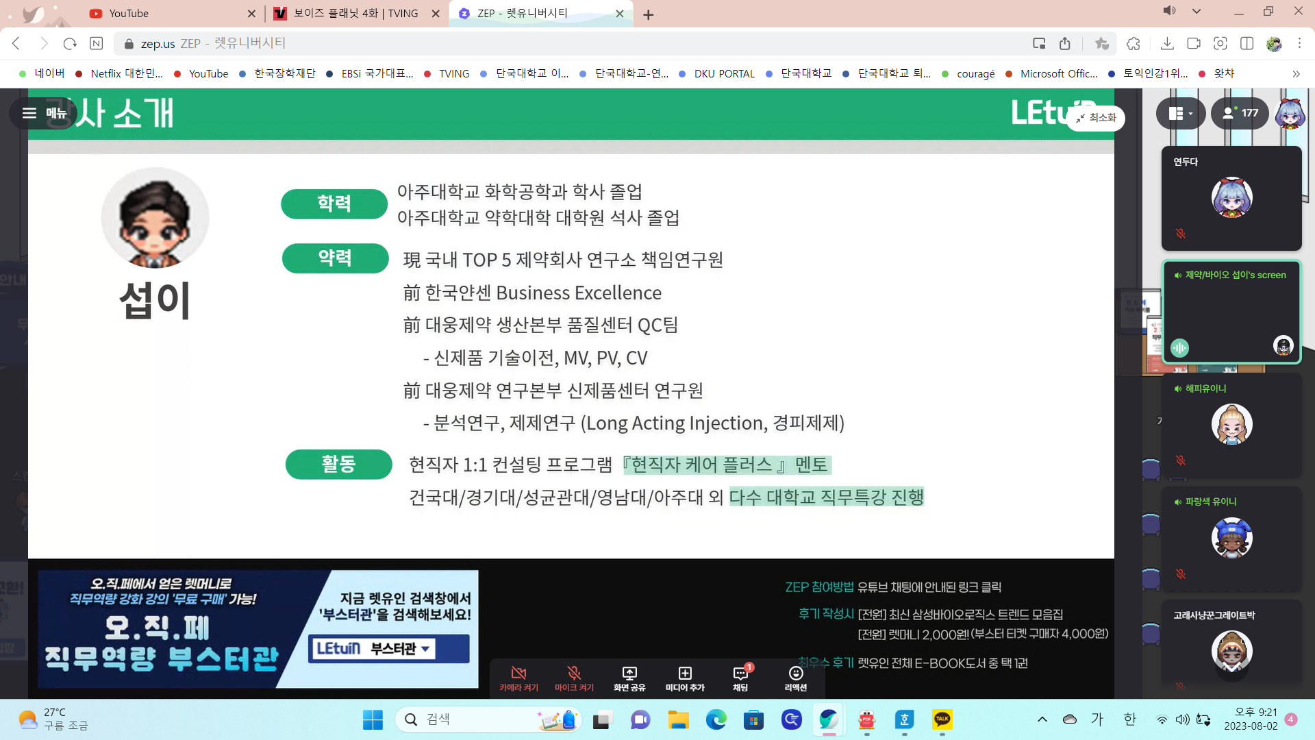 많은 분들이 질문을 하셨는데, 그 질문에 하나하나 정성스럽게 답변해주시는 모습이 너무 인상깊었습니다! 특강 시간동안 깔끔하고 간결하게 딱 필요한 내용들만 언급하시는 것 같아 더 집중할 수 있었습니다.