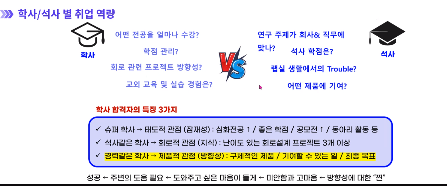 반도체 회로를 설계하는 분들의 업무와 일과에 대해서 알 수 있었고, 특히 석사만 회로 설계 쪽을 갈 수 있다는 편견을 없애는 내용 이였다. 학사에게 어떤 점을 바라는지 알 수 있었다.