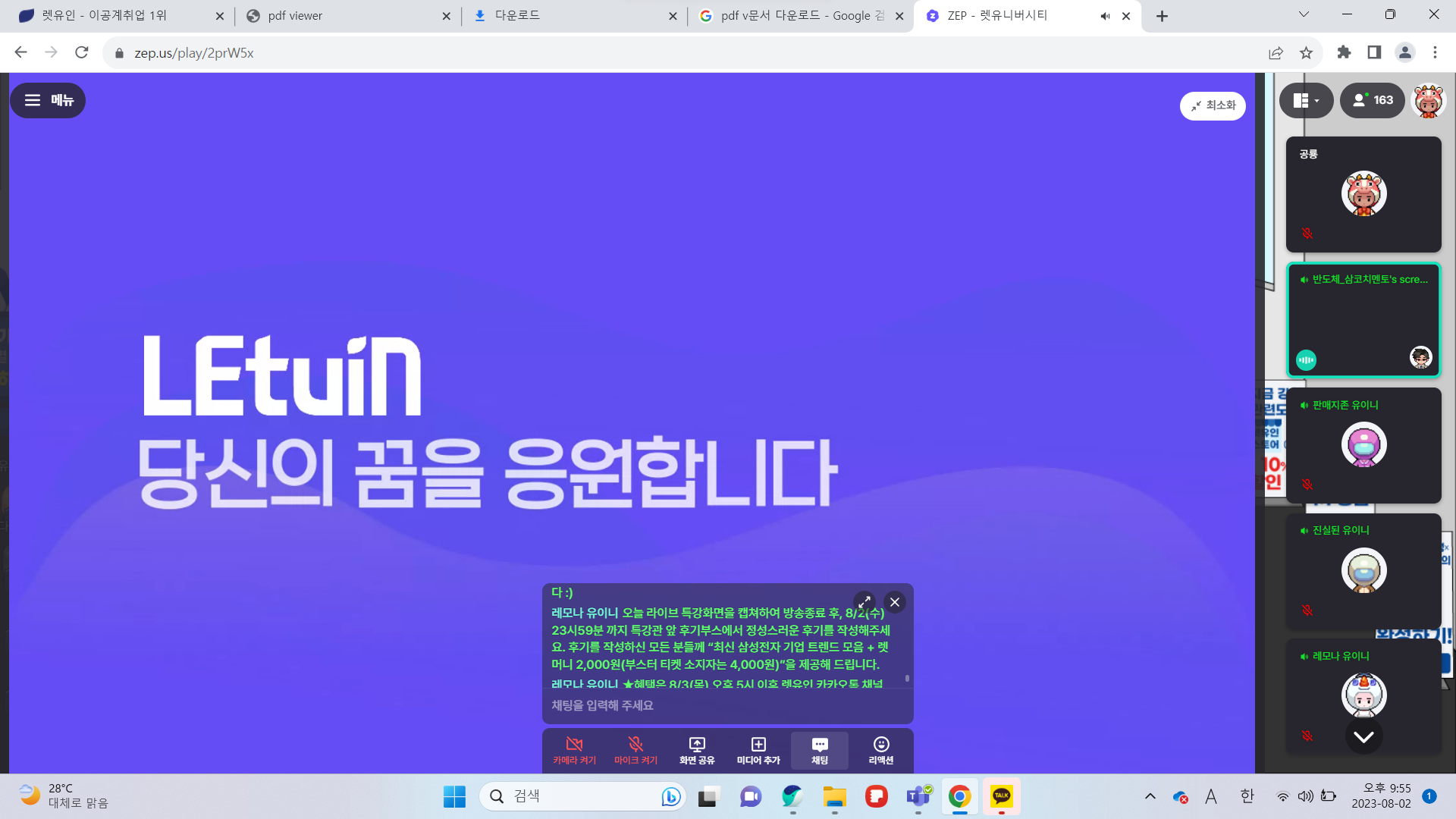 우연히 광고로 접했는데 뭐라도 해보자는 마음으로 참여했다. 생각보다 얻는 것이 많고 알게 되는 것도 많아서 만족했고, 렛유니버시티를 처음 사용해 봤는데 생각보다 재미있어서 놀라웠다. 무엇을 어떻게 준비해야 할지 감이 잡혀서 시원하다. 생방송 시청 인증 이미지