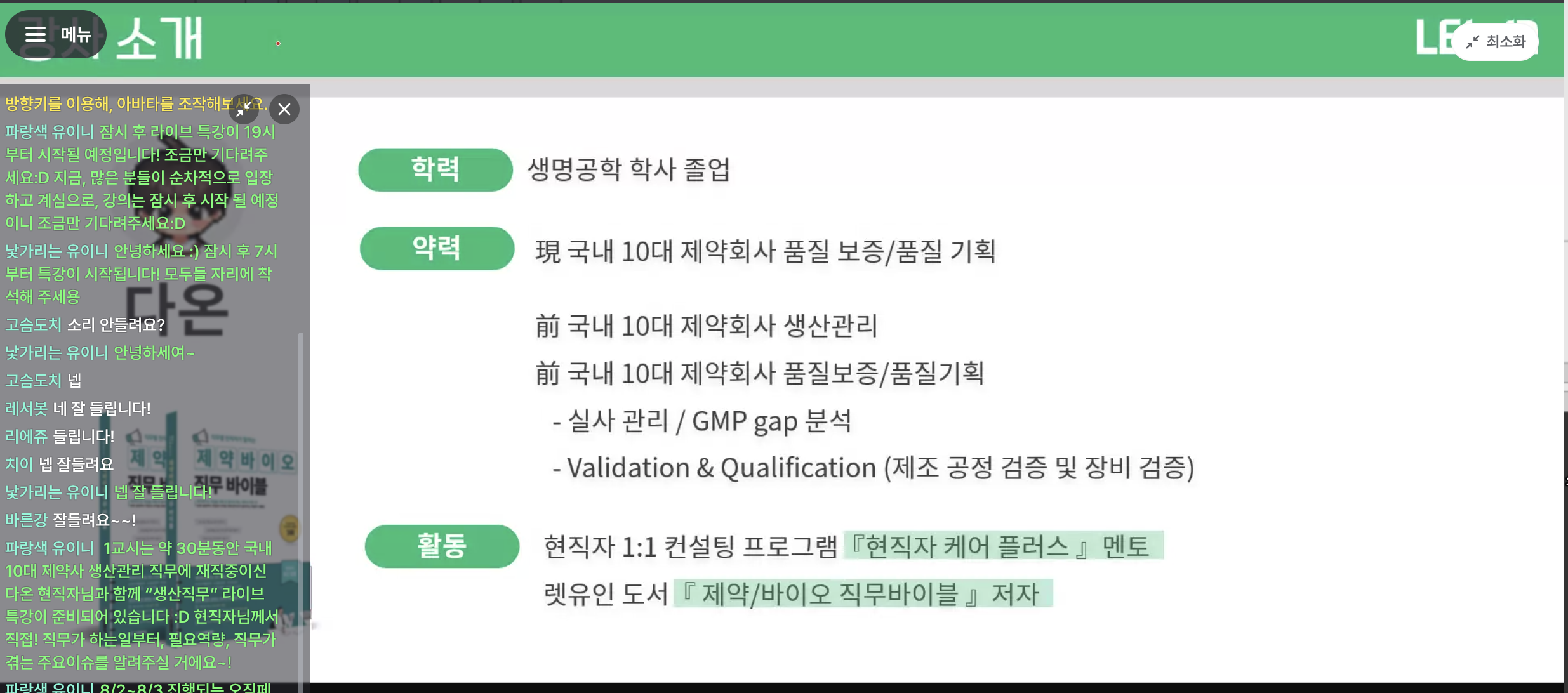 오늘 QC와 QA 직무 특강을 듣게 되었는데 비교적 짧은 시간이었지만 많은 내용과 취준생들에게 필요한 정보들만 알려주신것 같아서 매우 알찬 시간이었습니다!!! 앞으로도 이러한 현직자분들 특강이 많이 있었으면 하는 바램입니다. 정말 도움 많이 되었습니다. 감사합니다.