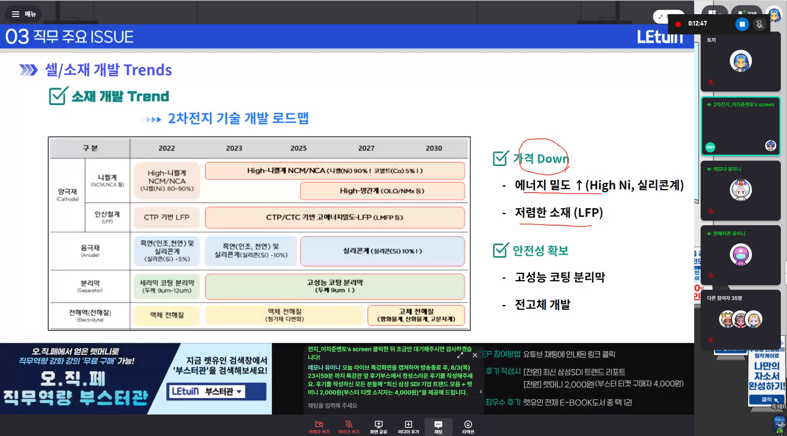 2차전지의 개발 업무 프로세스와 필요한 역량 등에 대해 수업 하셨습니다. 또한, 4대 핵심소재에 대해서 짧게 짚어주셨고, 어떤 부분이 현재 집중하고 있는 분야인지 말씀해 주셨습니다.