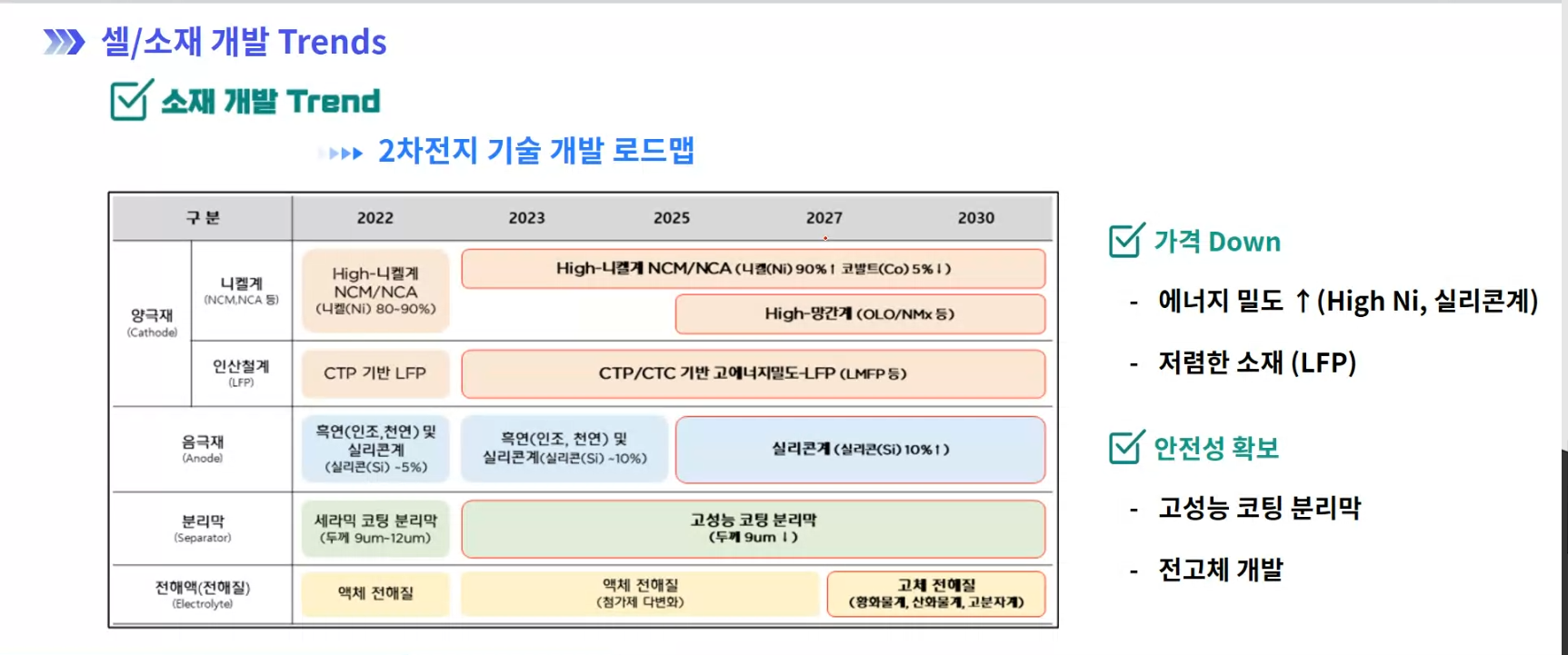 2차전지 Cell 개발 업무에 대해 3사의 직무별로 소개를 해주셨다. 삼성SDI, SK ON, LG에너지솔루션 각 특징은 달라 보이지만 사실은 비슷한 형태를 갖추고 있다. 또한 2차 전지의 최신 트렌드에 대해서도 설명해주셨다.