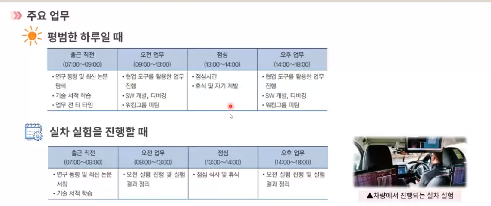 1,. 자분 환경 인지를 위한 인경신경망 개발 및 학습 2. 신호처리, 컴츄터비전 지식을 활용한 전/후처리 알고리즘 개발 빅데이터 기반 비선형 모델링 MLOps 업무 or DB도 어느정도 담당 하고 있는 것가음 전공 중요 X 니가 직무에 맞는 실력을 갖고 있음을 증명행라 3. 수강후기