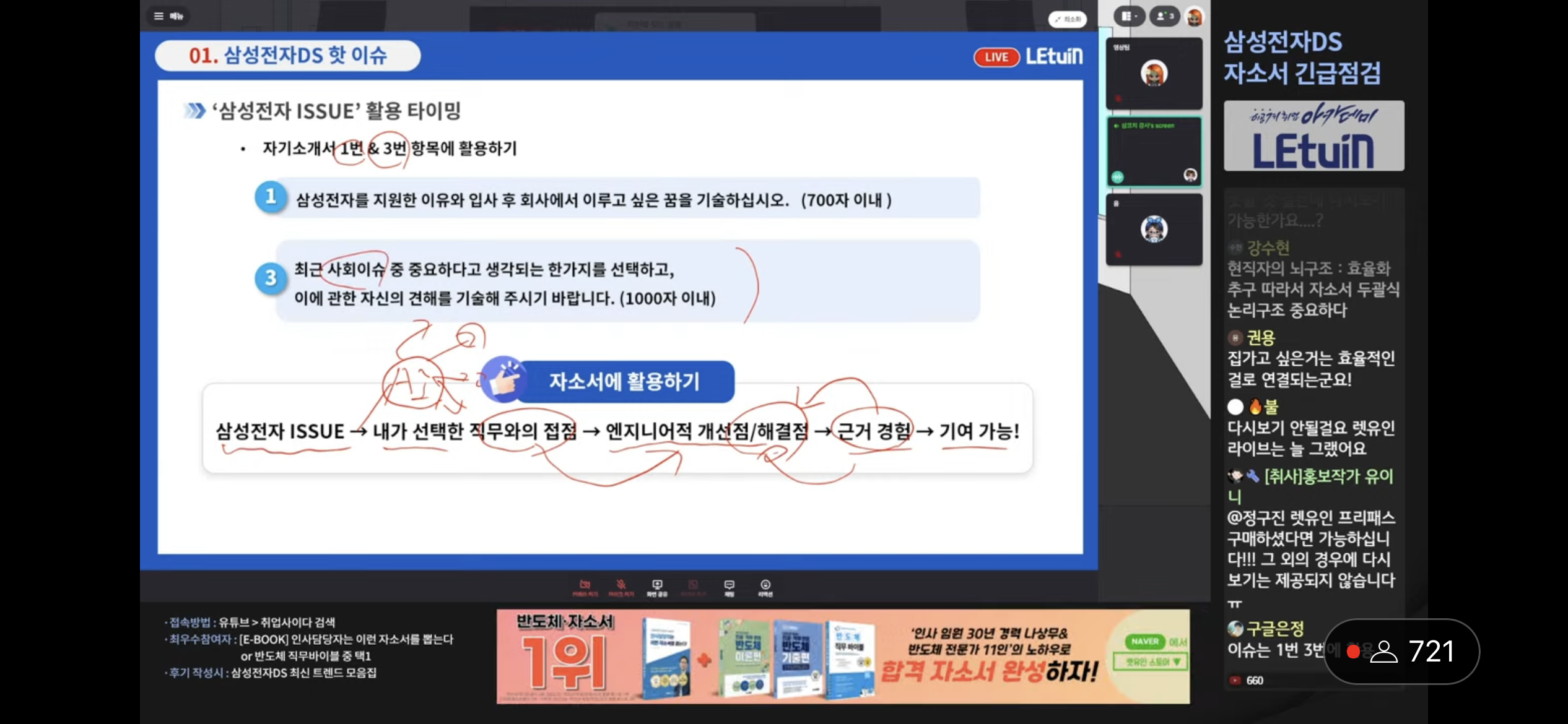 삼성전자 DS부문의 핫이슈를 메모리, 파운드리 등으로 알려주셨고 각 직무별 핵심 용어와 자소서 작성법까지 알 수 있었습니다!! Q&A 시간을 통해 취준생의 질문 또한 해결할 수 있었습니다!!