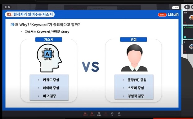 메모리 사업부에 지원을 희망하고 있었는데 삼성 메모리 반도체에 대해 알아야할 이슈들에 대해 예시를 들어주면서 알기 쉽게 설명해주셨고 해당 직무에 주로 사용하는키워드 및 이에 대한 설명을 통해 자소서 소재 중에 어떤 키워드를 활용해서 수정해야할지 방향을 잡을 수 있었습니다. 또한 자소서 파트별로 어떤 내용이 들어가야할지 설명해준것이 많은 도움이 됐습니다.
