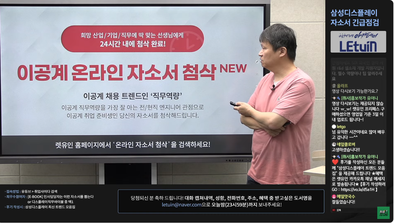 각 직무에 대한 상세한 설명과, 어떤 학부를 졸업한 취준생을 주로 필요로 하는지에 대해 설명해주십니다. 또한, 삼성디스플레이가 원하는 인재상과 이에 맞춰 어떻게 자소서를 써야 하는지 자세히 분석해주셨습니다.
