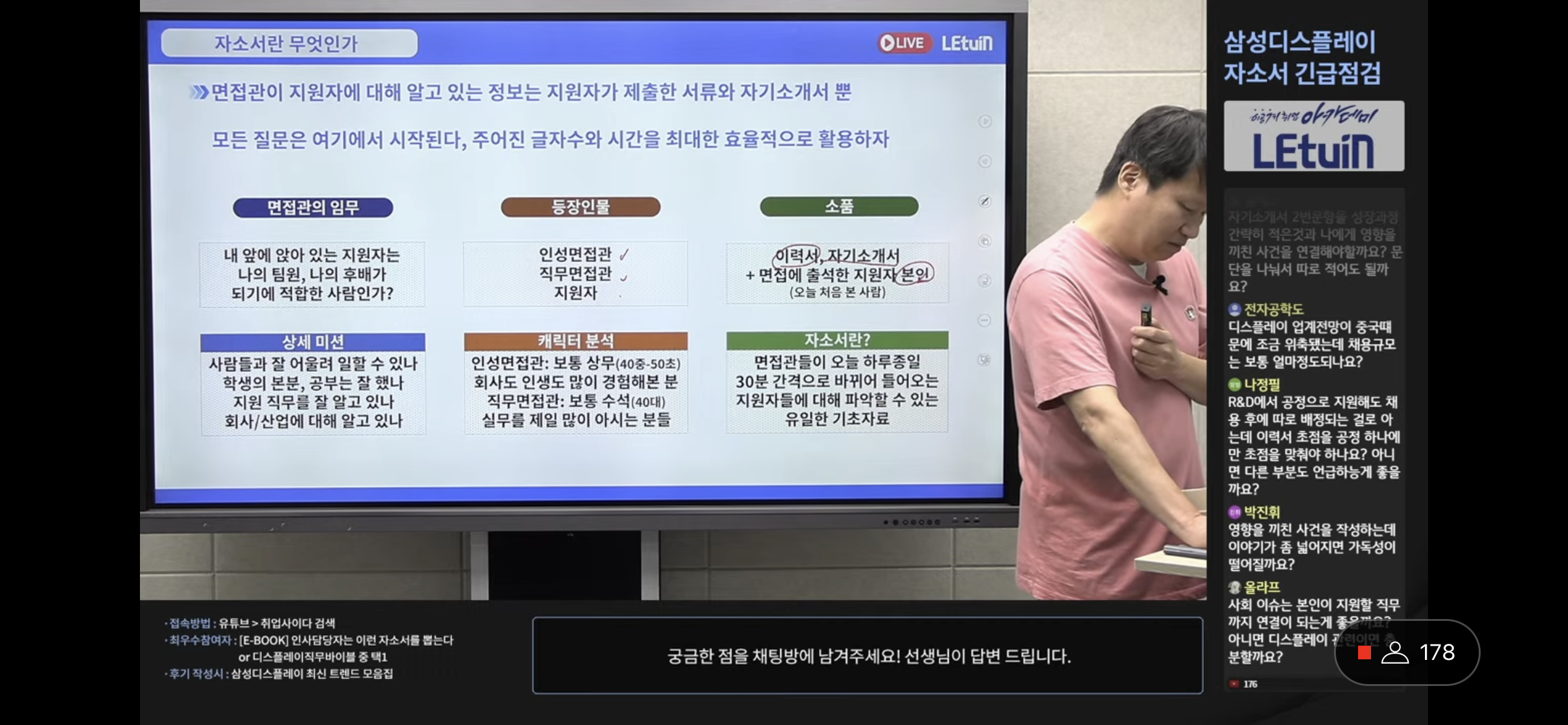 서류 탈락하는 경우가 많았는데 왜 탈락했는지 이제야알겠네요 삼성 디스플레이 지원은 오늘 강의 내용 참고하여 제대로 작성해봐야 겠어요 이후에 진행되는 다른 삼성 계열사 자소서 긴긎점검 특강도 꼭 챙겨들으려구요! 자소서 쓸때 막막하신 분들 듣는거 꼭 추천드려요 생방송 시청 인증 이미지