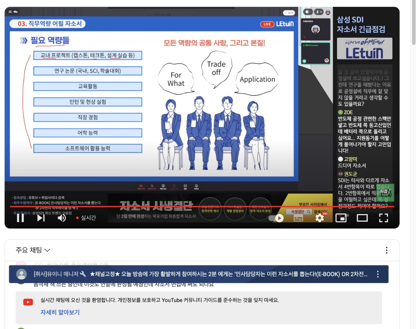 삼성 SDI 자소서 항목들에 집중해서 강의를 진행해주신 부분이 좋았다. 강의 도중에도 자소서에만 집중할 수 있도록 유도를 많이 해주셨고 구성도 자소서 항목별로 분석해주셨다. 자소서는 "자기" 소개이기 때문에 내 이야기를 진솔하게 들려주라는 말씀이 와닿았고 모든 항목에 최대한 직무역량을 어필할 수 있도록 작성해야겠다고 생각했다.