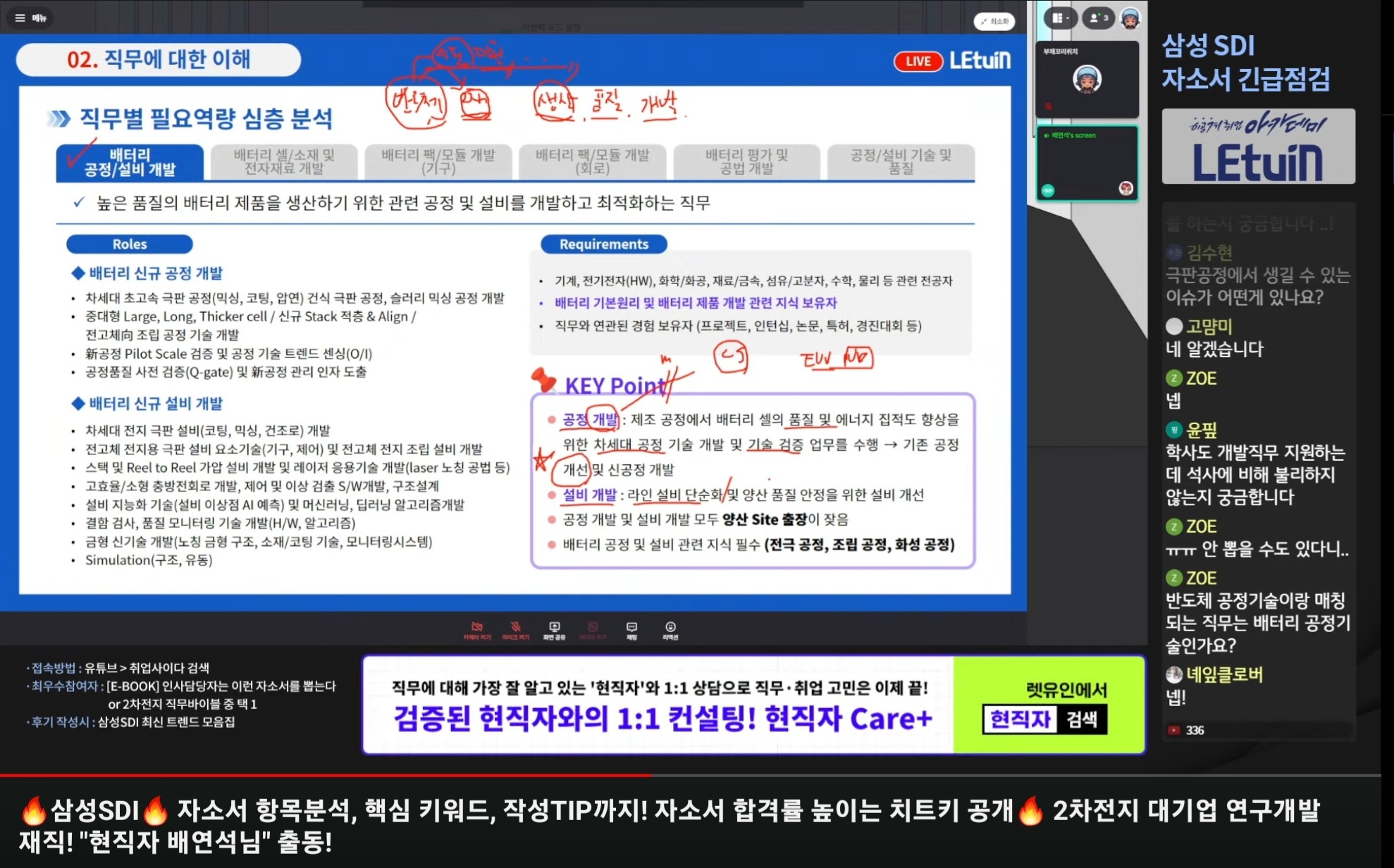 삼성SDI이 사업과 관련 이슈, 2차전지 산업에 대한 이해, 여러 직무에 대한 설명 및 직무역량 어필법, 직무 적합도를 강조하는 자소서 작성법에 대한 내용의 강의를 수강하였습니다.