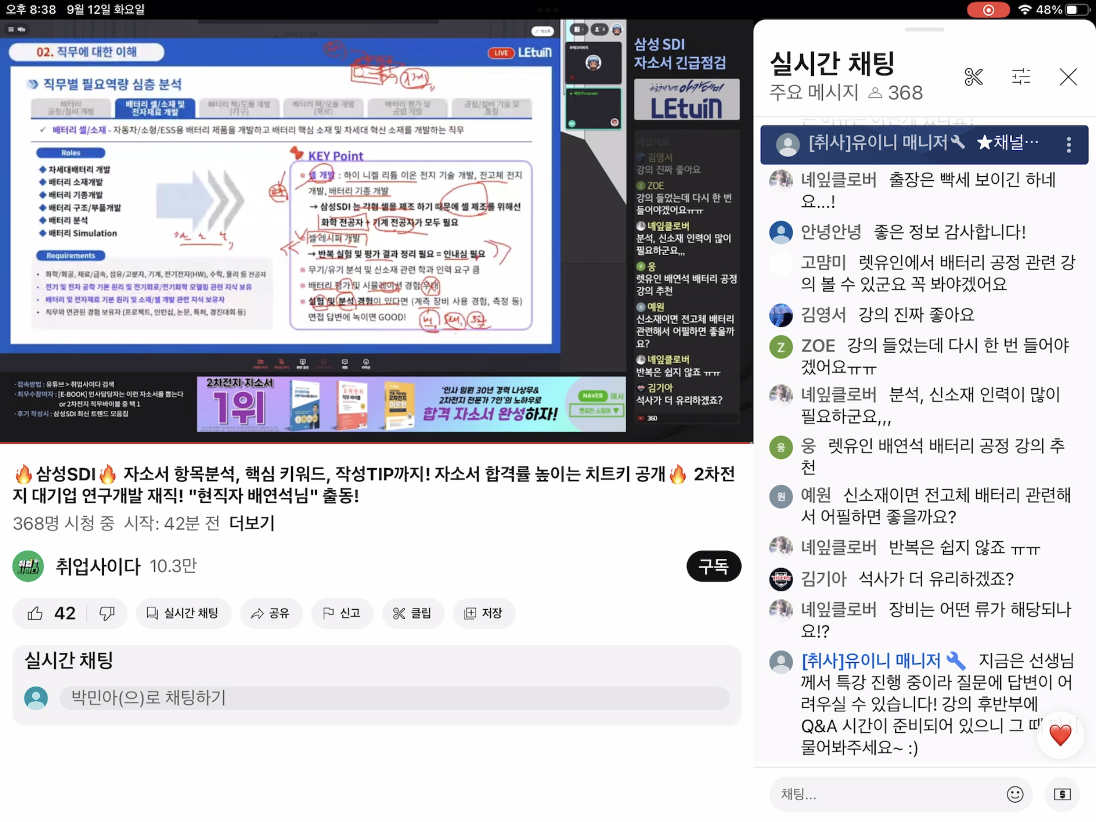 삼성 sdi 모집공고의 직무별 특성과 가지고 있어야 할 역량 등 각각의 직무마다의 특성을 설명해주셨습니다. 자소서 목록 1,2,3 번의 써야할 점과 쓰지 말아야할 특징등에 대하여 설명해주셨습니다.