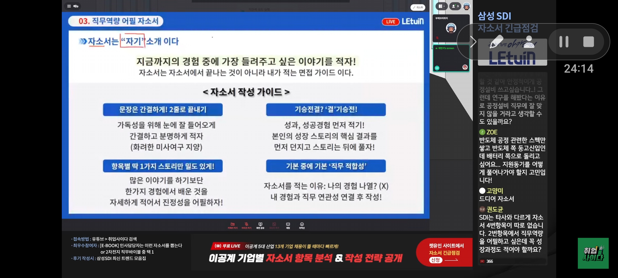 직무별로 상이한 직무어필역량을 알 수 있었습니다. 또한 SDI의 트렌드와 경쟁업체의 트렌드 개발 현황까지 알려주셔서 최근 이슈에 대해 어떻게 서술할지 갈피를 잡을 수 있었습니다. 학과에 맞는 지원부서도 알 수 있어 유익한 시간이었습니다.