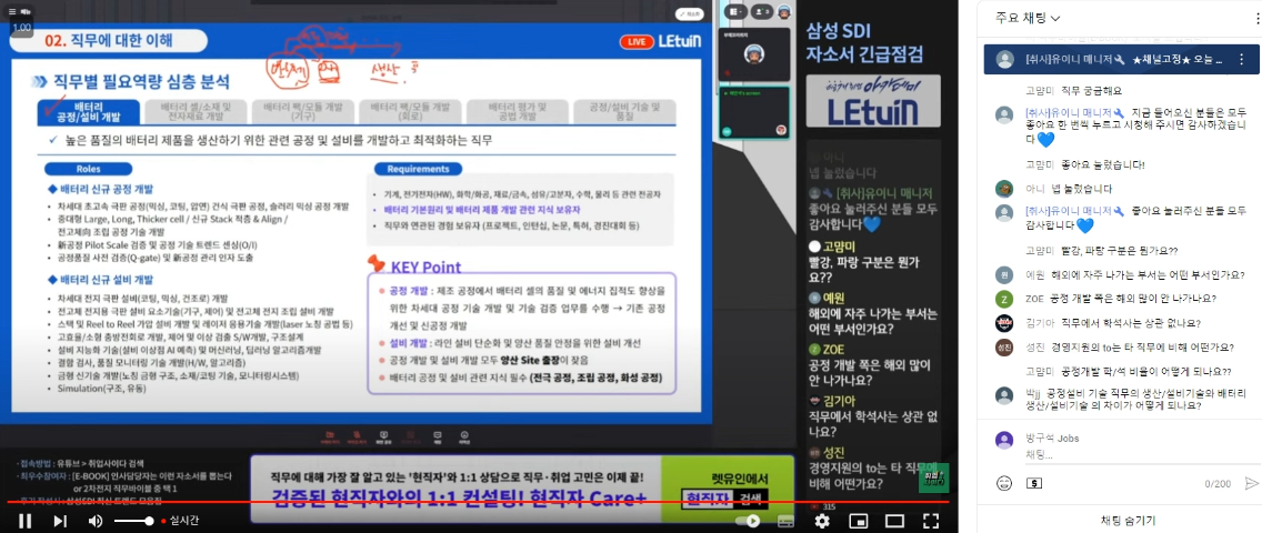 그리고 삼성 SDI의 직무를 매우 꼼꼼하게 설명해주시고 마지막에 삼성 SDI 자소서 항목별 작성법까지 도움이 정말 많이 되는 강의였습니다. 생방송 시청 인증 이미지
