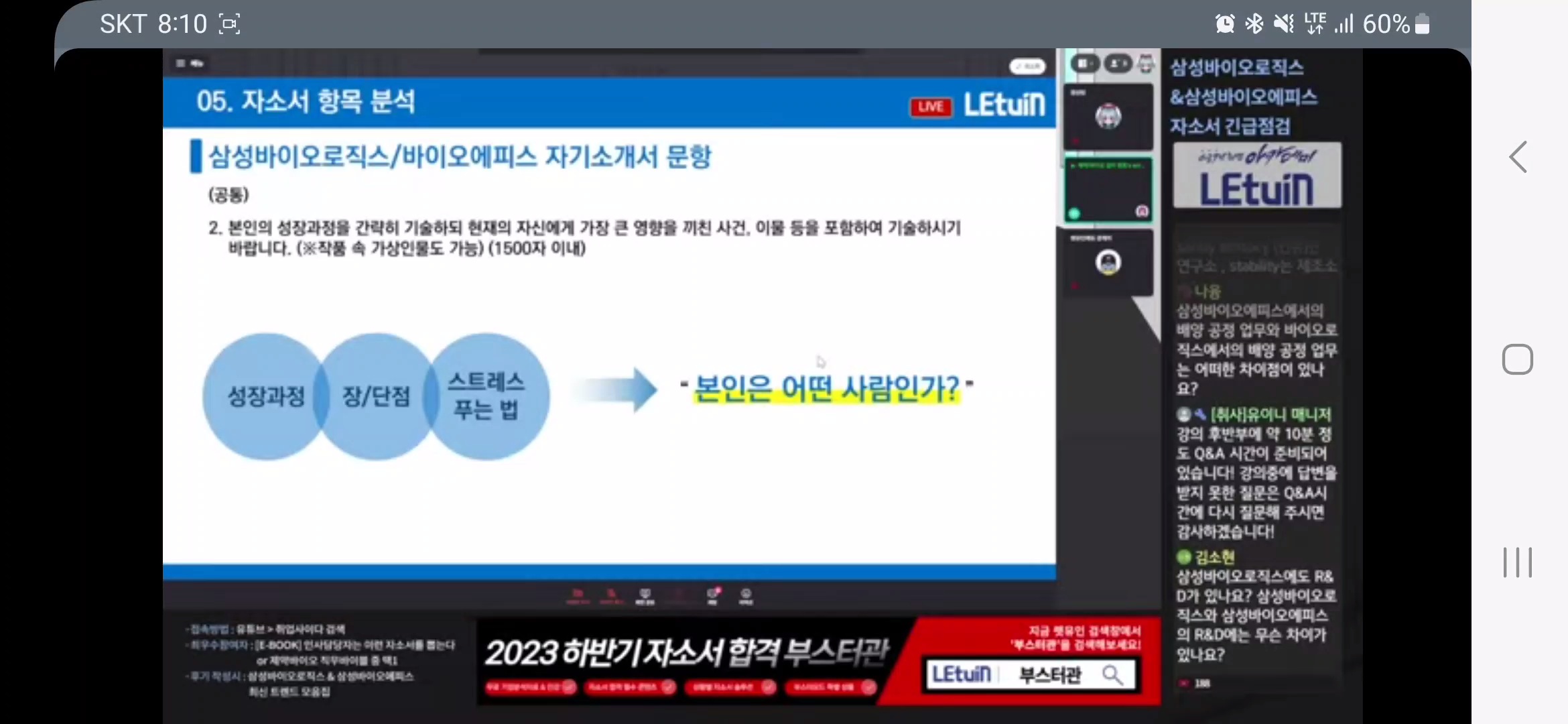 실제 삼성 바이오로직스와 바이오에피스의 자소서 항목에서 원하는 내용이 무엇인지 가르쳐주셨고, 각 직무에 대한 정보를 알려주셨습니다. 특히 문제해결능력에서 요구되는 사고 방식을 예를 들어 알려주신 내용은 정말 신선했습니다.