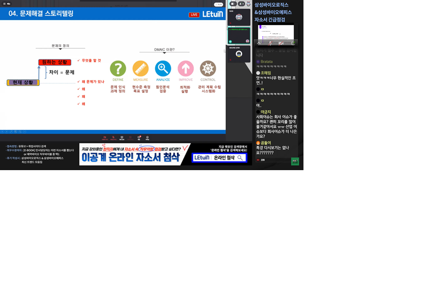 삼성바이오로직스와 삼성바이오에피스 회사와 직무에 대한 이해를 높이고, 자소서 항목 분석을 통해 합격 가능성을 높일 수 있는 특강. 자소서 작성 팁과 어떤 직무에서 사용해도 좋을 DMAIC과 5 Why를 배울 수 있었습니다.