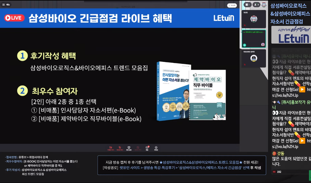 삼성바이오로직스와 삼성바이오에피스 소개부터 바이오의약품의 공정을 간단히 다뤄주셨고, 채용공고에 올라온 직무들도 훑어주셨습니다. 이후 자기소개서 항목을 하나씩 살펴보고 활용하면 좋을 스토리텔링법을 설명해주셨습니다.