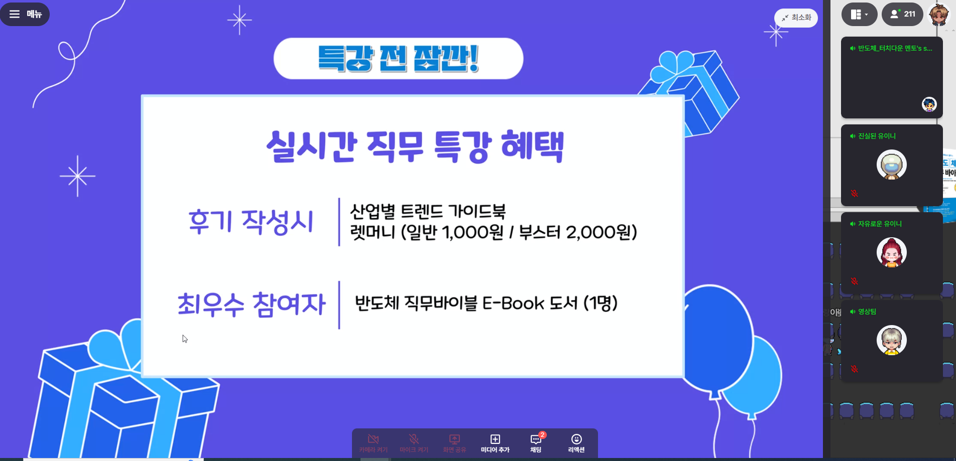 직무에관해서 하나씩 설명해주셔서 좋았습니다. 직무에 필요한 역량을 얘기해주시면서 어떤부분이 있으면 좋은지 없더라도 어떤 식으로 갖고있는 것이 좋은지 설명해주셨습니다. 짧은시간이지만 유익한 시간이었습니다