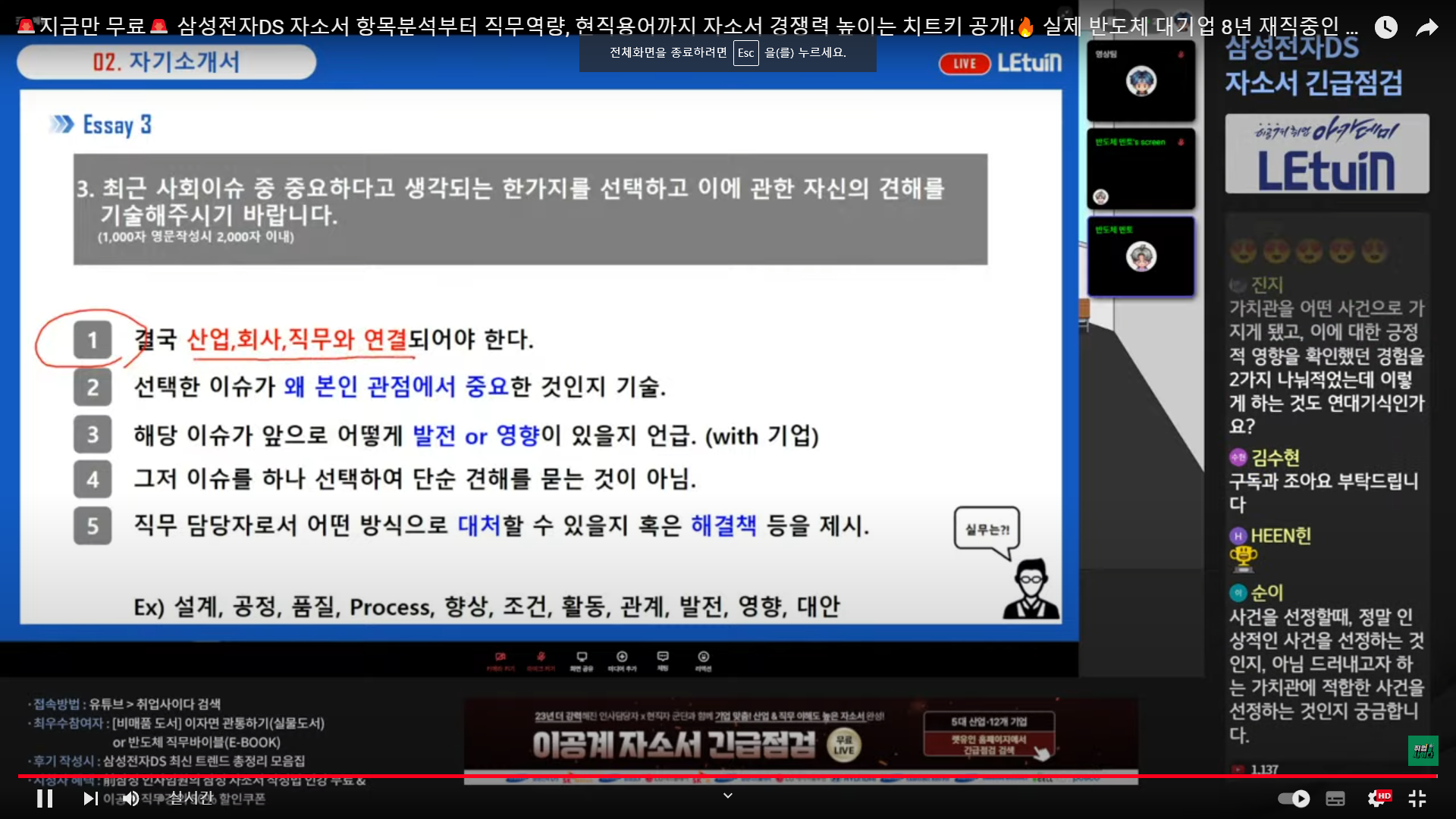 2.강의 내용 각 자소서 문항별로 적어야 할 키워드와 방향성을 제시해주셨으며, 이에 대한 꿀팁들을 너무 많이 방출해주셨습니다. 다양한 전공 지식을 보유한 인재를 원하며, 반도체 공정, 디바이스, 물리 쪽의 전공을 공부해야 하고 이 뿐만 아니라 직무 역량에 대한 중요성도 한 번 더 상기시킬 수 있는 강의었습니다. 3. 강의 느낀점 삼성전자대학생 인턴 공채가 뜨고 혼자서 막막했는데 이번 특강을 듣고 자소서 적을 때 방향성을 알게 되었습니다. 많은 도움이 되었습니다 감사합니다 ㅎㅎ