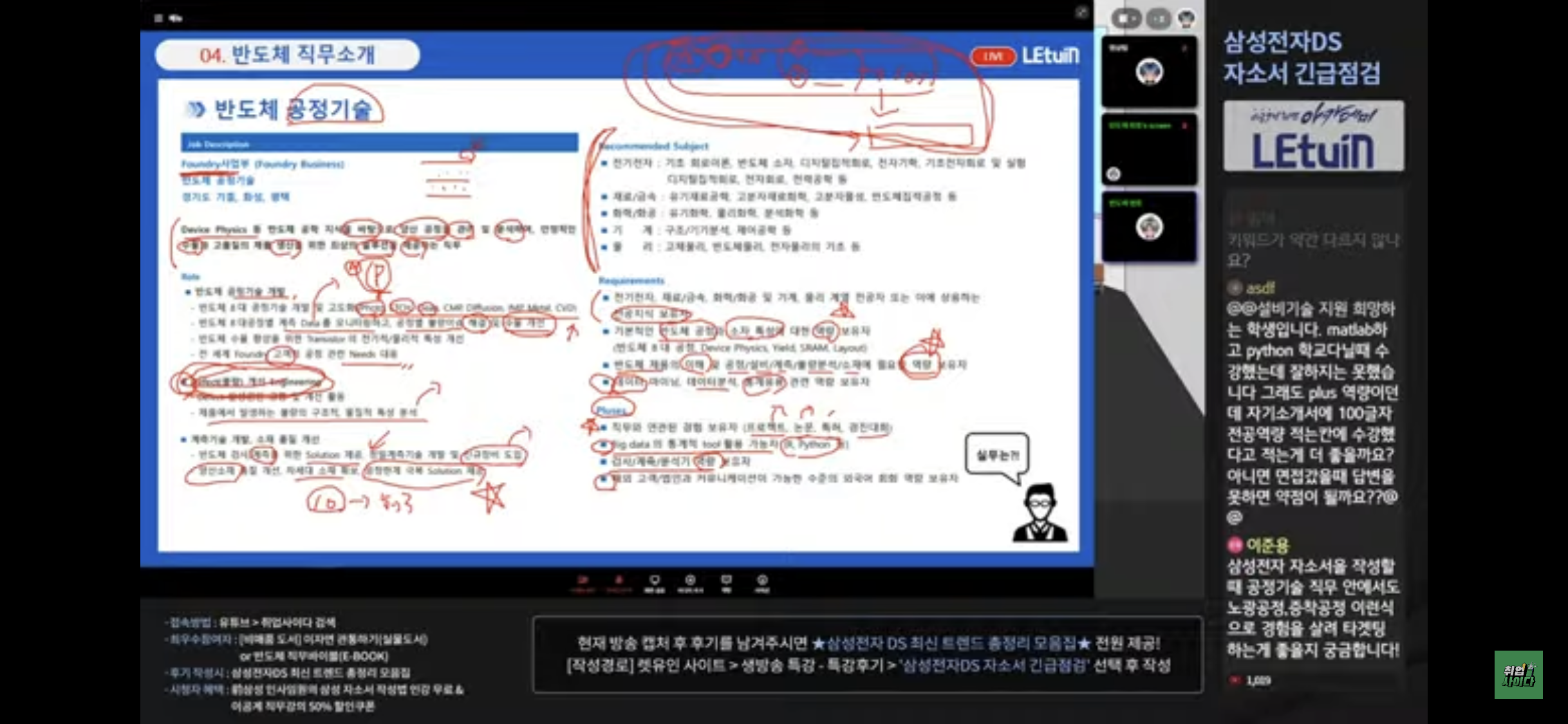 2. 강의내용 자소서 = 직무임을 끊임없이 강조해주셨습니다. 서류 - GSAT - 면접이라는 흐름은 모두 직무로 연결되며, Essay 1~4 항목 모두 직무와 관계되어야 함을 알 수 있었고, 특히 Essay3 주제 선택의 중요성을 알게 되었습니다. 3. 강의 느낀점 JD에서 와닿지 않는 부분들을 현업의 업무를 예로 들어주시며 설명해주신 부분이 좋았습니다.
