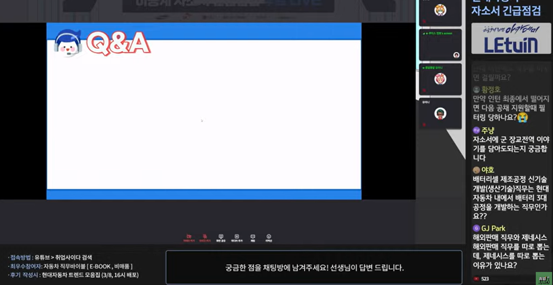현대자동차 이번 채용과 관련하여 자기소개서 문항에 대해 어떤 것을 물어보는 문항인지, 어떤 부분에 더 주의를 기울여야 하는지 알려주셨습니다. 이에 더해 자소서 작성의 기본적인 부분과 선생님이 보시기에 '이렇게는 하지말자' '이런건 꼭 지키자' 이런 포인트들을 잘 설명해주셨습니다. 감사한 시간이었습니다.
