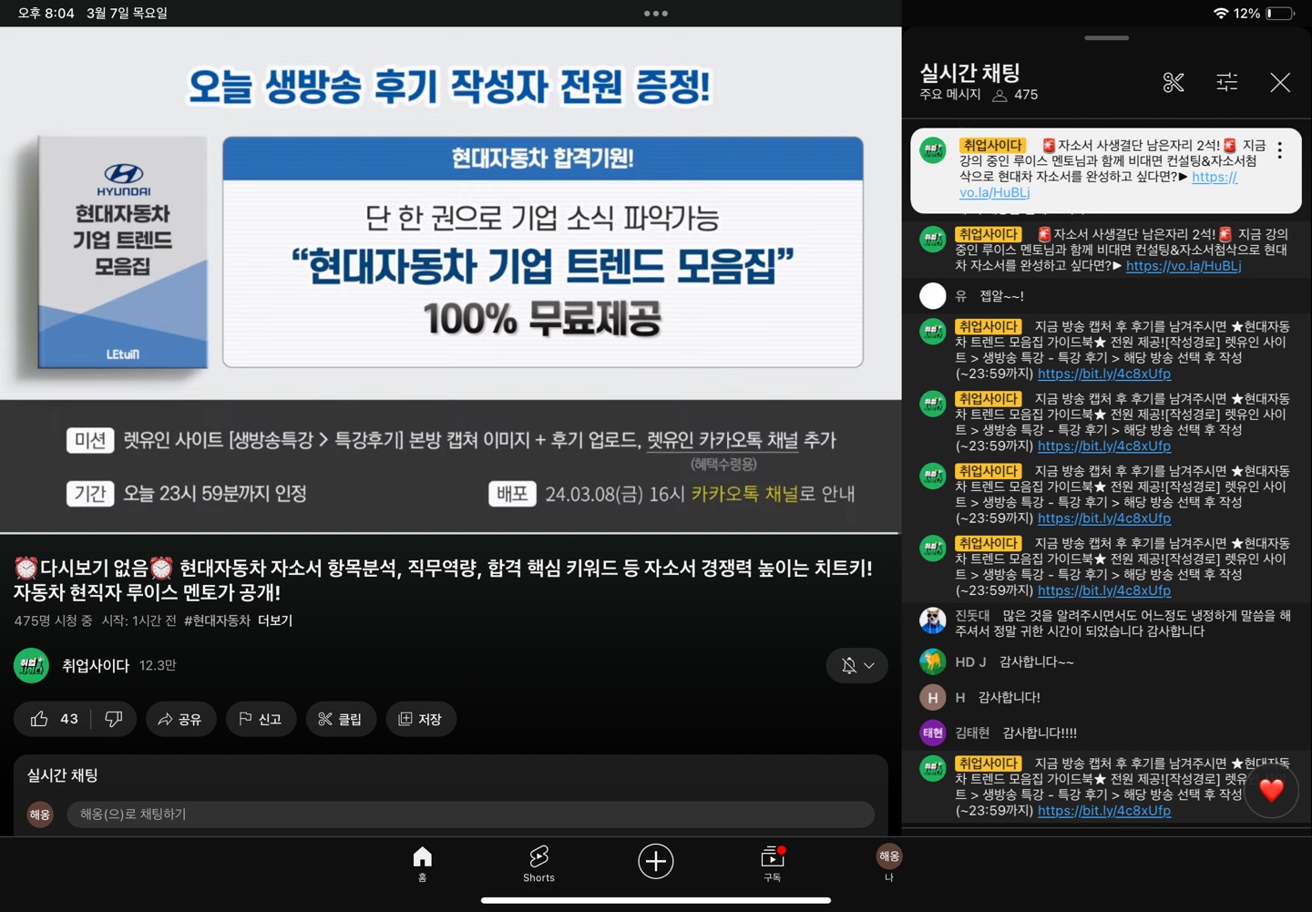 각각 작성포인트를 알려주셔서 조금 더 방향성을 잡을 수 있었습니다. 팁들이 아주 도움이 많이 되었으며, 예시를 들어서 설명해주셔서 이해하기 쉬웠습니다. 다음에도 또 듣고 싶네요 생방송 시청 인증 이미지