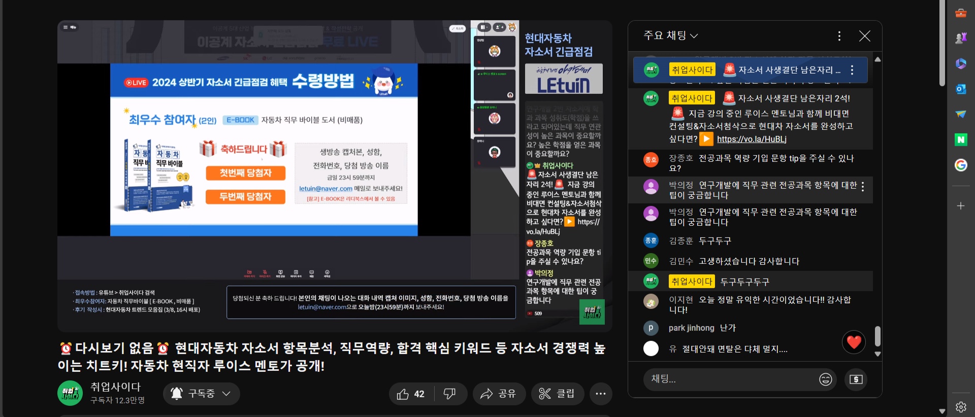 현대자동차의 최신 이슈와 직군별 자소서 항목 분석 및 자소서 관련 Tip, 항목별 어필 포인트에 대해 들을 수 있었습니다. 자소서 항목별로 어떤식으로 써야하는지 예시와 함께 설명해주셨습니다.