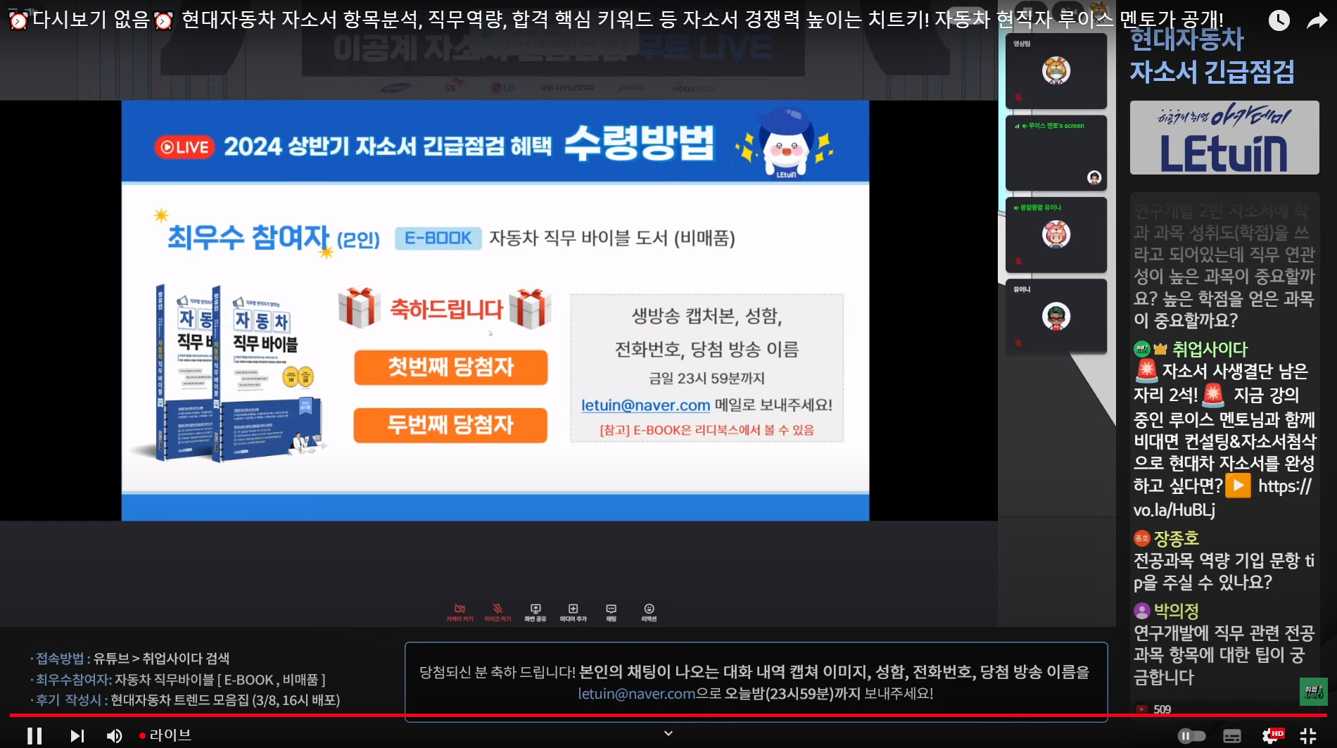 특히 자소서 TIP 중에 이성에게 고백하는 관점으로 설명하신 부분이 있었는데 한번에 이해가 되었습니다. 앞으로도 이와같은 특강이 있다면 반드시 듣고싶습니다. 생방송 시청 인증 이미지
