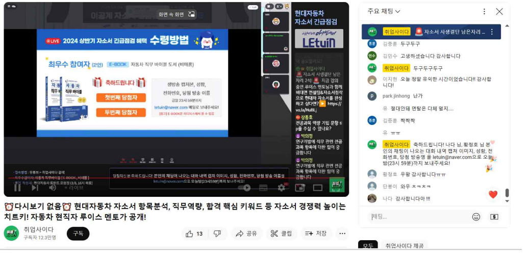 강의는 훌륭했지만 솔직히 처음 강의를 듣는 사람들에게는 많이 유익하지만 저 같지 렛유인 강의를 많이 듣는 취준생들은 이미 대부분 아는 내용이기에 큰틀은 이미 잡고 있습니다. 저는 제가 가진 역량을 바탕으로 직무를 찾고 싶었지만 원하는 답을 못 얻어서 많이 아쉬웠씁니다 생방송 시청 인증 이미지