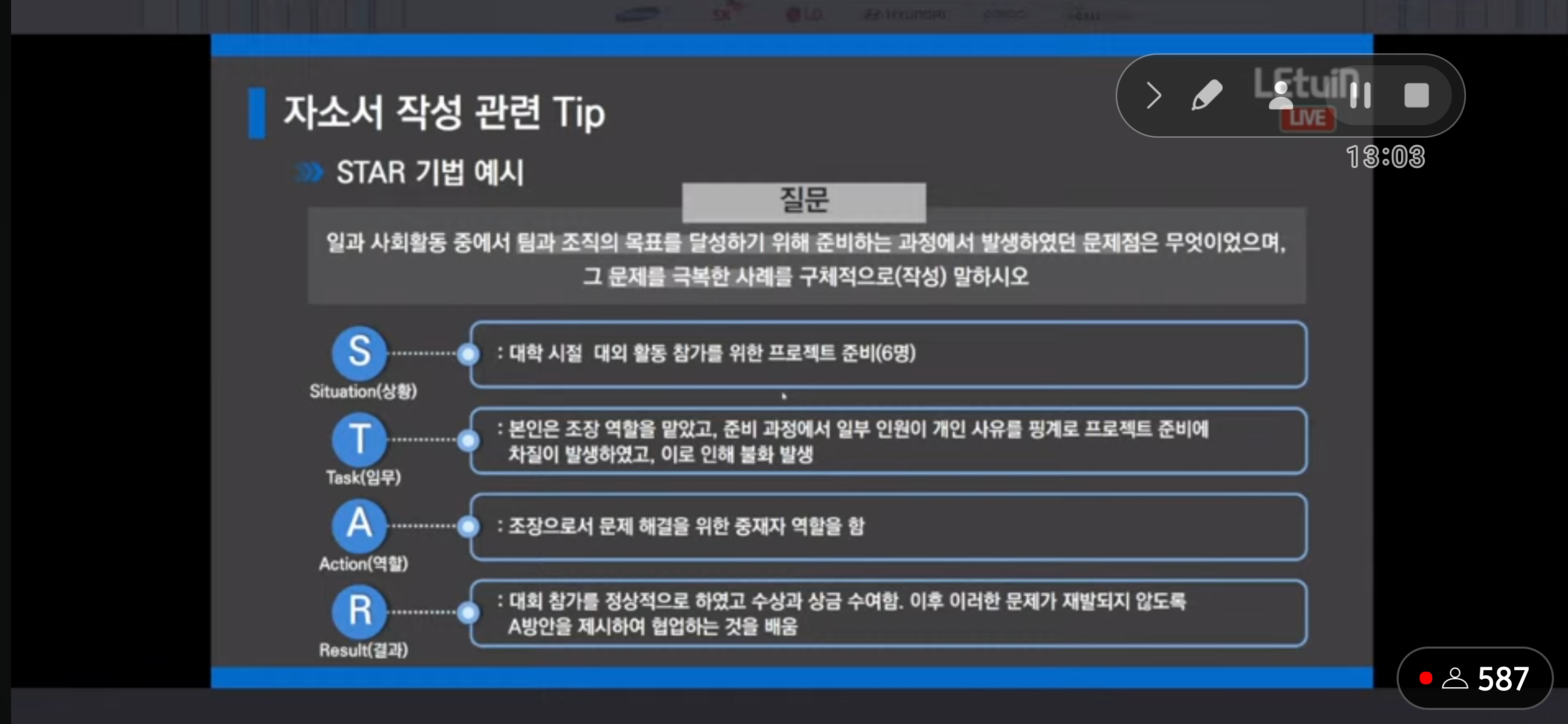 현재작성한 자소서의 방향성을 정할 수 있는 좋은 강의였습니다. 특히 구매 직무 지원자로써 희토류와 이차전지에 대한 이해도를 필요로함을 느끼게 해주었다. 생방송 시청 인증 이미지