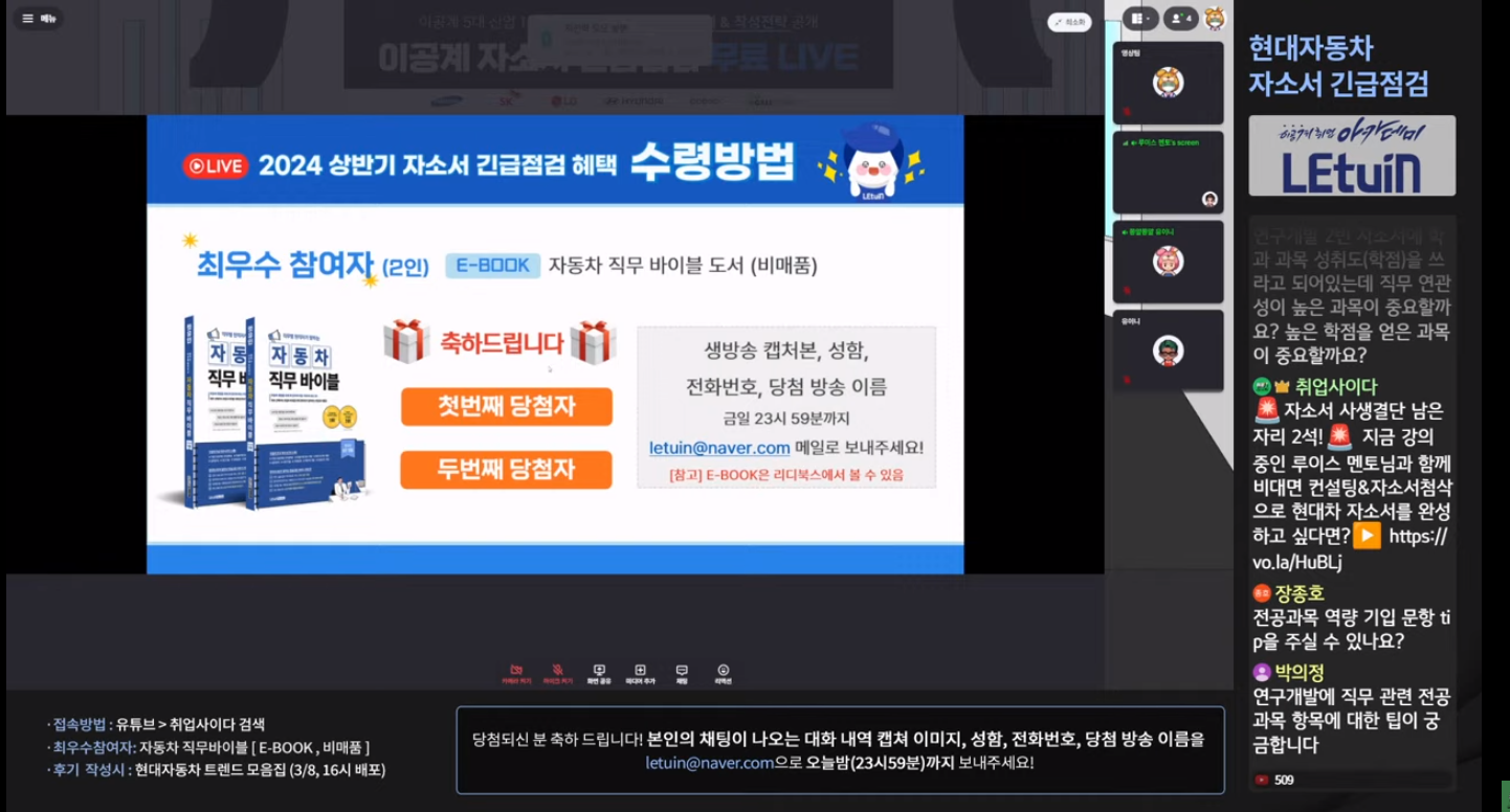 자기소개서 관련해서 항목별로, 직무별로 어떤 부분들을 강조하고 어필해야하는지 다양한 팁과 예시로 설명해주셔서 쉽게 이해할 수 있었습니다. 생방송 시청 인증 이미지