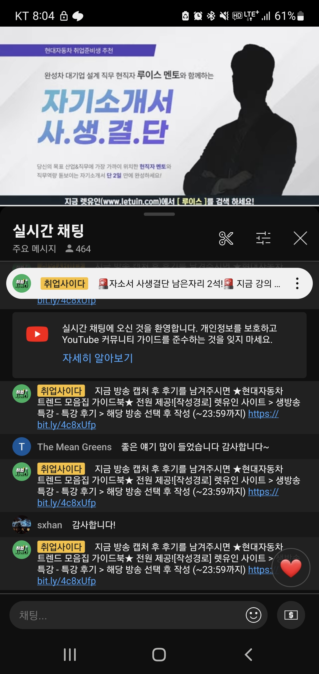 잘 쓴 자소서를 벤치마킹해라. 자기와 가장 잘 맞는 것 같은 직무에 지원해라. 현직자에게 자신의 비전에 대해 물어봐라. 이러한 내용들을 바탕으로 자소서에 참조하여 좋은 소스가 될 것 같습니다. 생방송 시청 인증 이미지