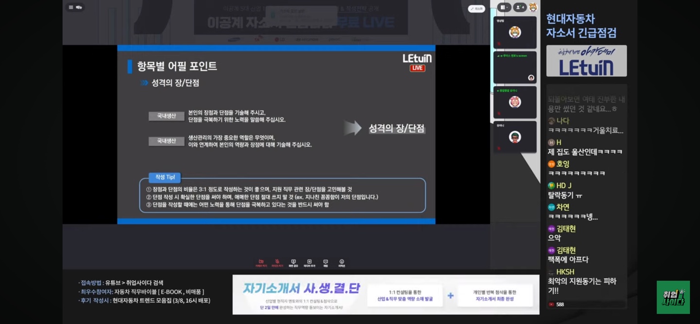 현대차의 자소서 항목이 어렵지 않은 편이란 것을 알게되었습니다. 따라서 포기하지않고 최대한 두괄식, 간결한문장, 직무관련내용, 확실한 표현들을 사용하여 작성해야함도 알게되었습니다.