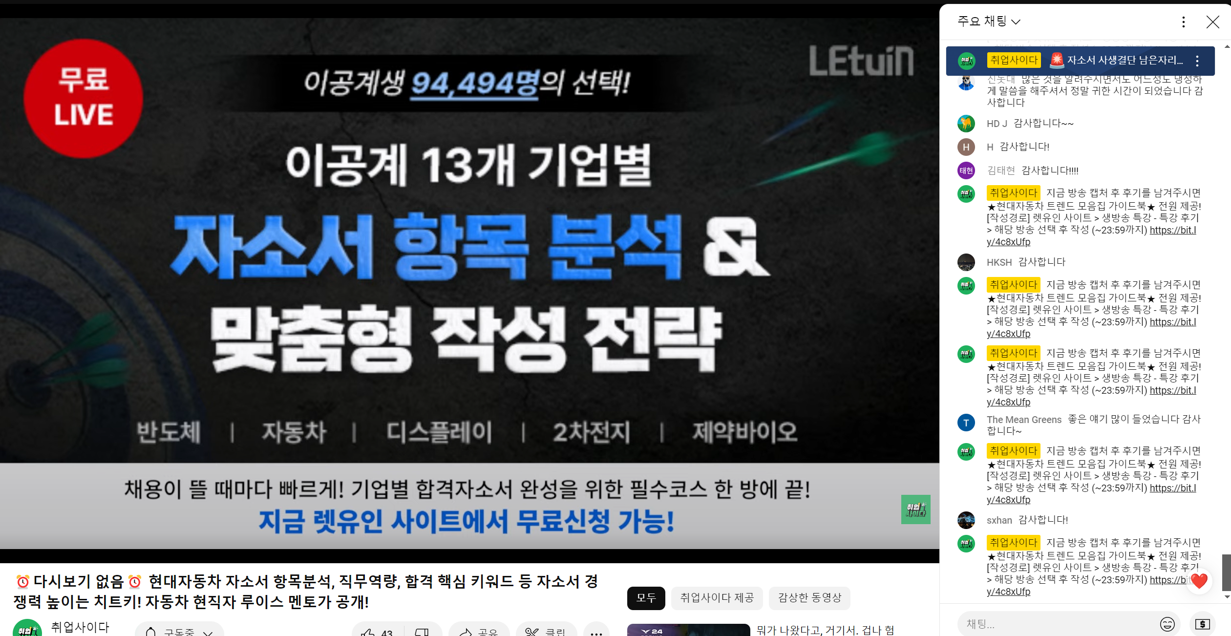 이번 현대자동차 채용 공고에 대한 간단히 설명해주셨습니다. 그리고 자동차 산업 관련 최신 이슈를 다뤄주셨습니다. 또한, 자소서 작성 관련 Tip과 항목별 어필 포인트를 집어주시고, 끝으로 QnA 진행해주셨습니다.