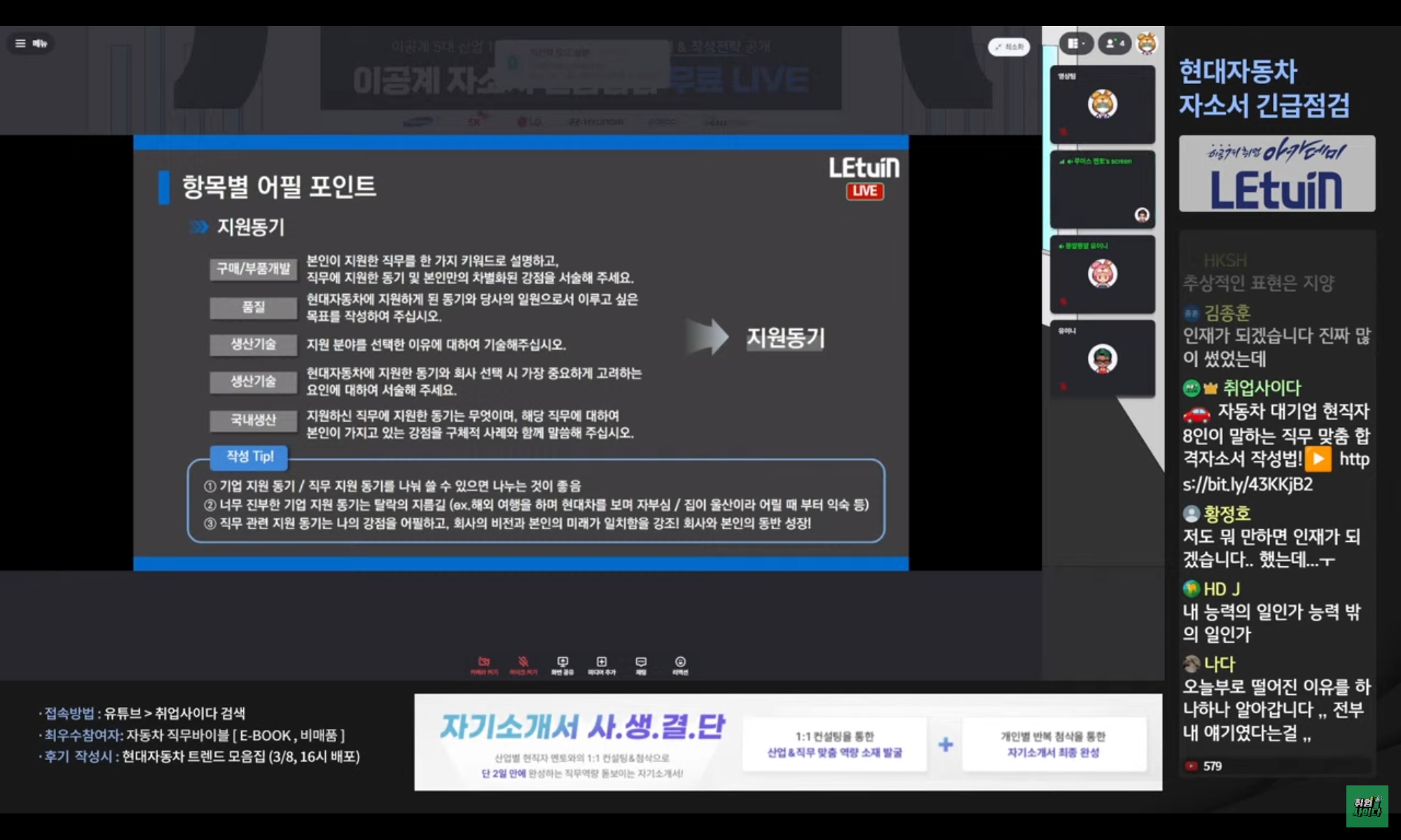 막막했던 자소서 작성에 큰 틀을 잡아주셔서 좋았습니다. 자소서 항목별로 주의해야 할 사항들이 작성했던 글 수정에 큰 도움이 될 것 같습니다. 그리고 자동차 최신 이슈를 상세히 알 수 있었습니다.