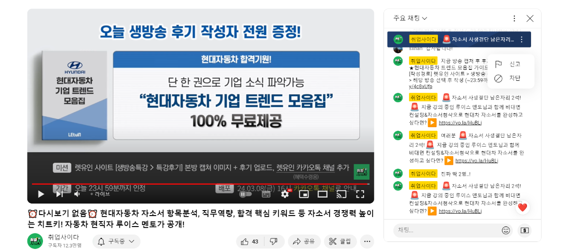 자소서 지원동기를 쓰는 과정에서의 팁을 자세하게 가르쳐 주셔서 좋았습니다. 생방송 시청 인증 이미지