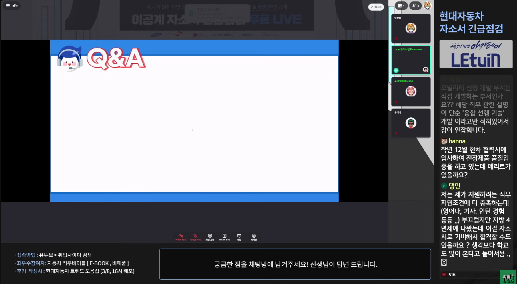 자동차 산업 관련 이슈와 자소서 작성 Tip에 대해 들었습니다. 그리고, 자동차 관련 산업 이슈에서 전동화에 대한 소식과, 현대차의 방향에 대해 알 수 있었으며 어떤 역량을 어필해야하는지 알 수 있었습니다.