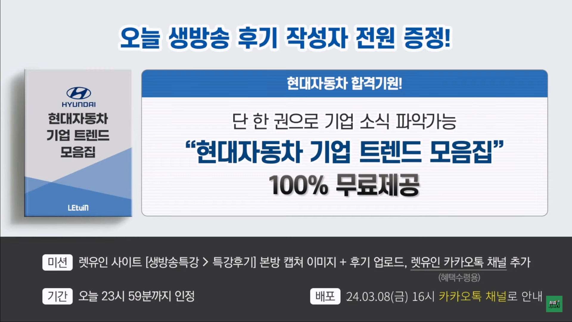 자소서 작성법을 적절한 비유를 들어 피부에 와닿게 설명하신 것 같아서 좋았다. 다른 자소서에도 적용할 수 있을 만한 보편적 내용을 담고 있다. 생방송 시청 인증 이미지